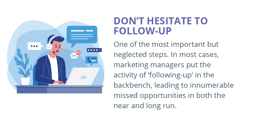 Probably one of the most obvious actions that every marketer has in their mind, but unfortunately since it is so obvious, it is also one of the most neglected steps. In most cases, marketing managers while in their process of prioritizing other prominent actions put the act of ‘follow up’ in the backbench leading to innumerable missed opportunities in both the near and long run.
