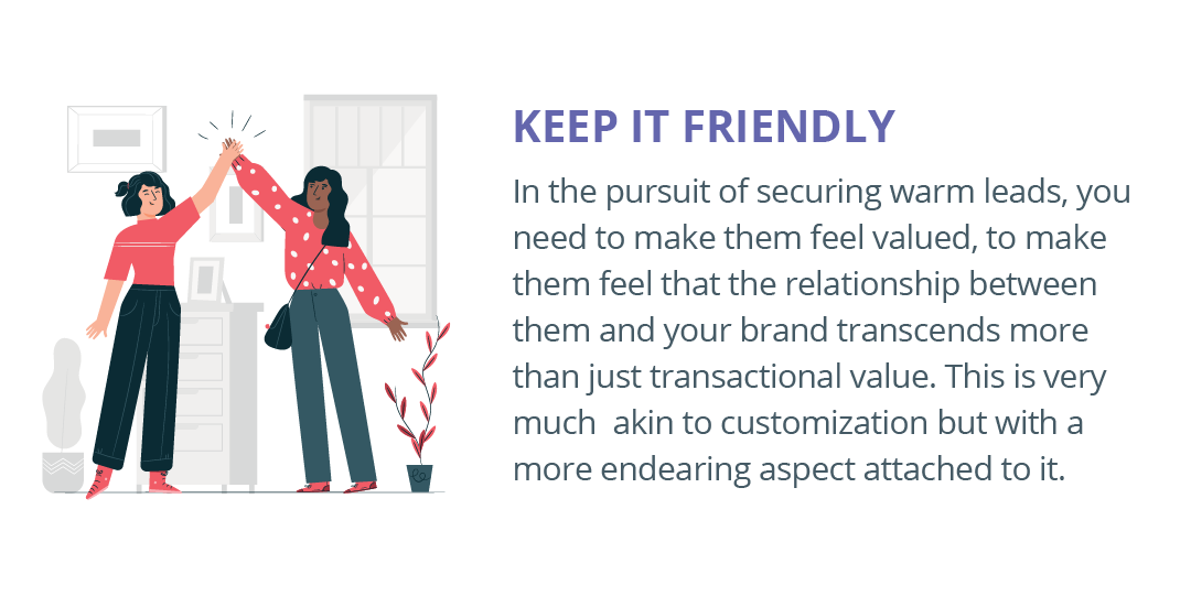 In the pursuit of securing warm leads, you need to make them feel valued, to make them feel that the relationship between them and your brand transcends more than just transactional value. This is very much akin to customization but with a more endearing aspect attached to it.
