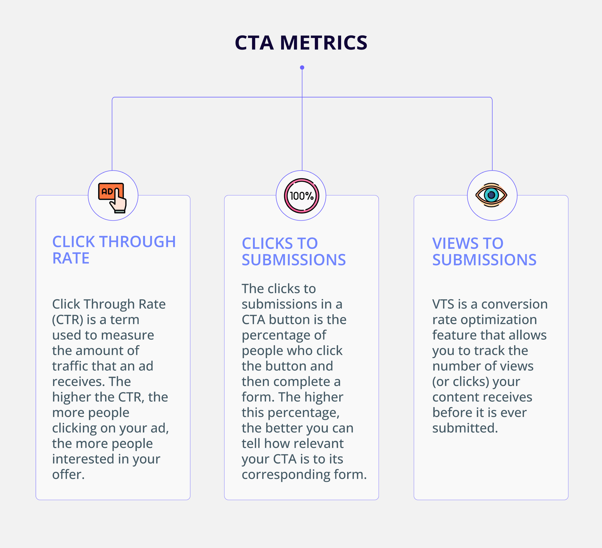 The clicks to submissions in a CTA button is the percentage of people who click the button and then complete a form. The higher this percentage, the better you can tell how relevant your CTA is to its corresponding form.