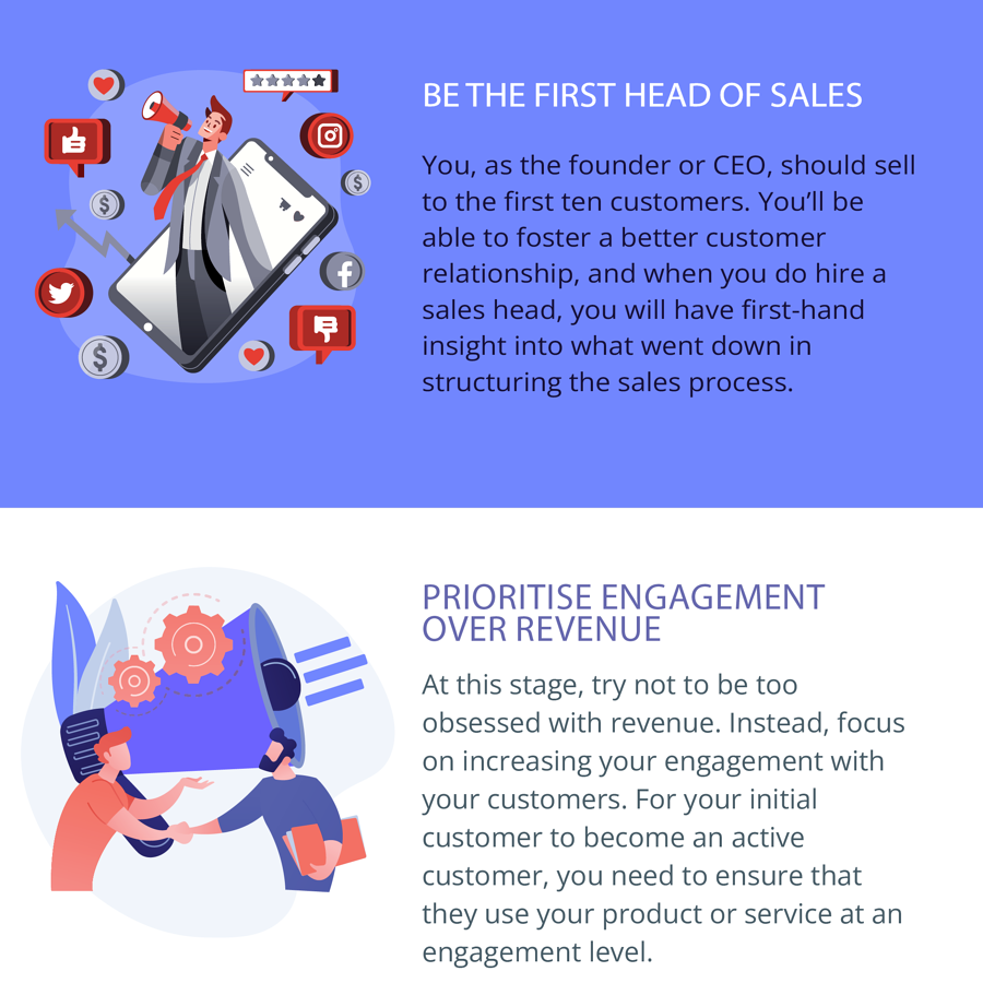 Also, it is strongly suggested that instead of a professional, you, as the founder or CEO, should sell to the first ten customers. This is necessary for strengthening and knowing the base of what your sales scale would become in the future.