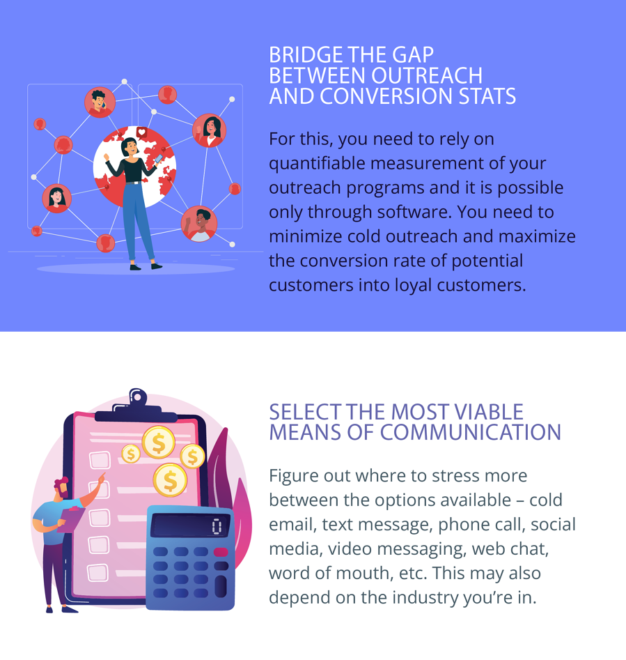 For this, you need to rely on quantifiable measurement of your outreach programs and it is possible only through software. You need to minimize cold outreach and maximize the conversion rate of potential customers into loyal customers.