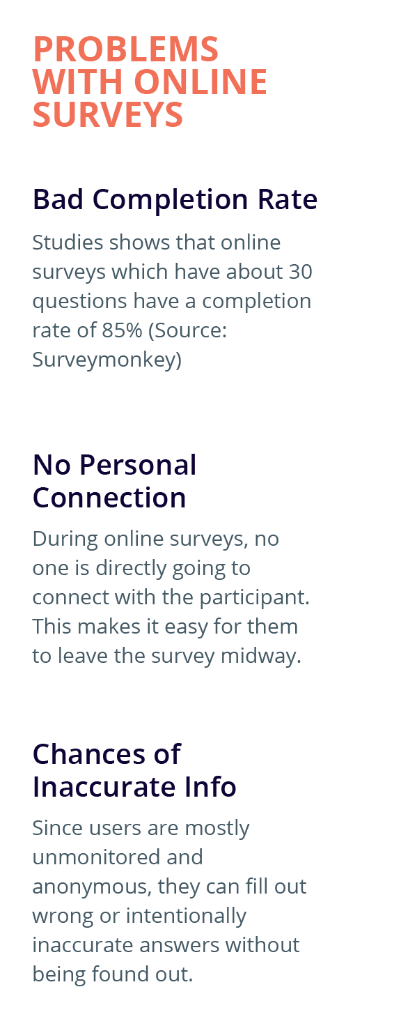 During online surveys, no one is directly going to connect with the participant. This makes it easy for them to leave the survey midway.