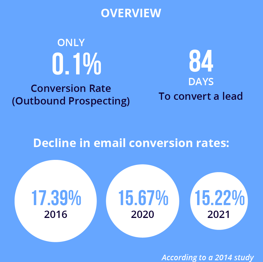 According to a 2014 study, outbound sales prospecting methods including email prospecting fared poorly with a 0.1% conversion rate. The same survey revealed that it takes 84 days to convert a lead into an opportunity.
