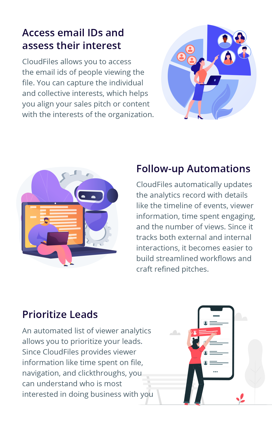 CloudFiles fills this gap to equip marketers and salespeople with viewer status and interaction with the file. It, thus, helps them understand their interest in the business, gauge the next steps, and improvise their pitch to convert the lead.