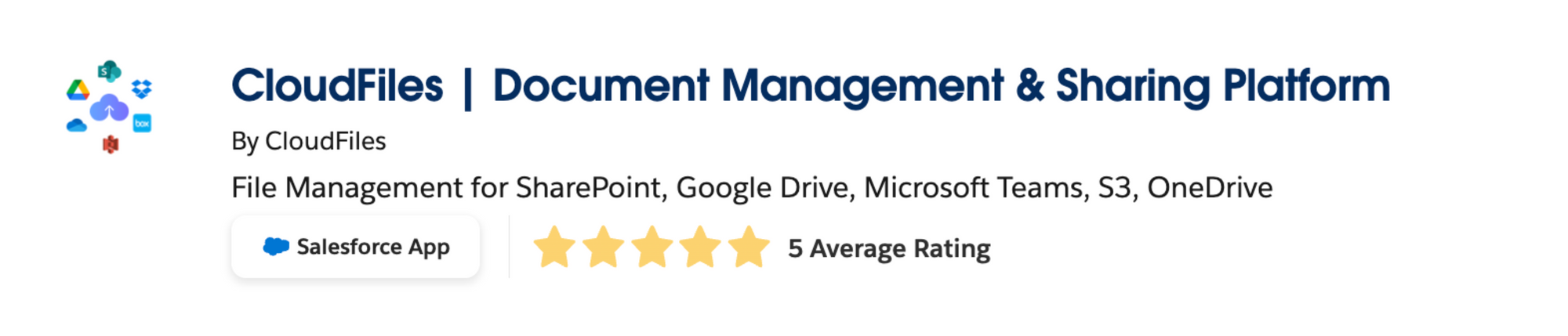 CloudFiles streamlines document management and sharing by seamlessly integrating with various external storage platforms, including SharePoint, Google Drive, OneDrive, Microsoft Teams, and AWS S3. This integration enables comprehensive file management, including real-time 2-way syncing, allowing users to upload, preview, search, edit, and download files directly within the Salesforce environment. Businesses benefit from CloudFiles' user-friendly interface and its robust file management capabilities. Its configurable security settings and insightful analytics enable secure collaboration and comprehensive reporting, ensuring a seamless workflow and enhanced productivity.