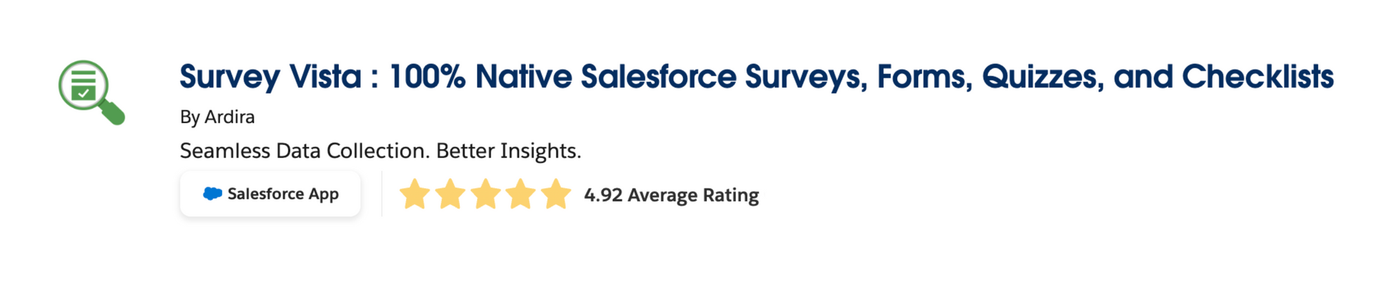 - Survey Vista (by Ardira): 100% Native Salesforce Surveys, Forms, Quizzes, and Checklists