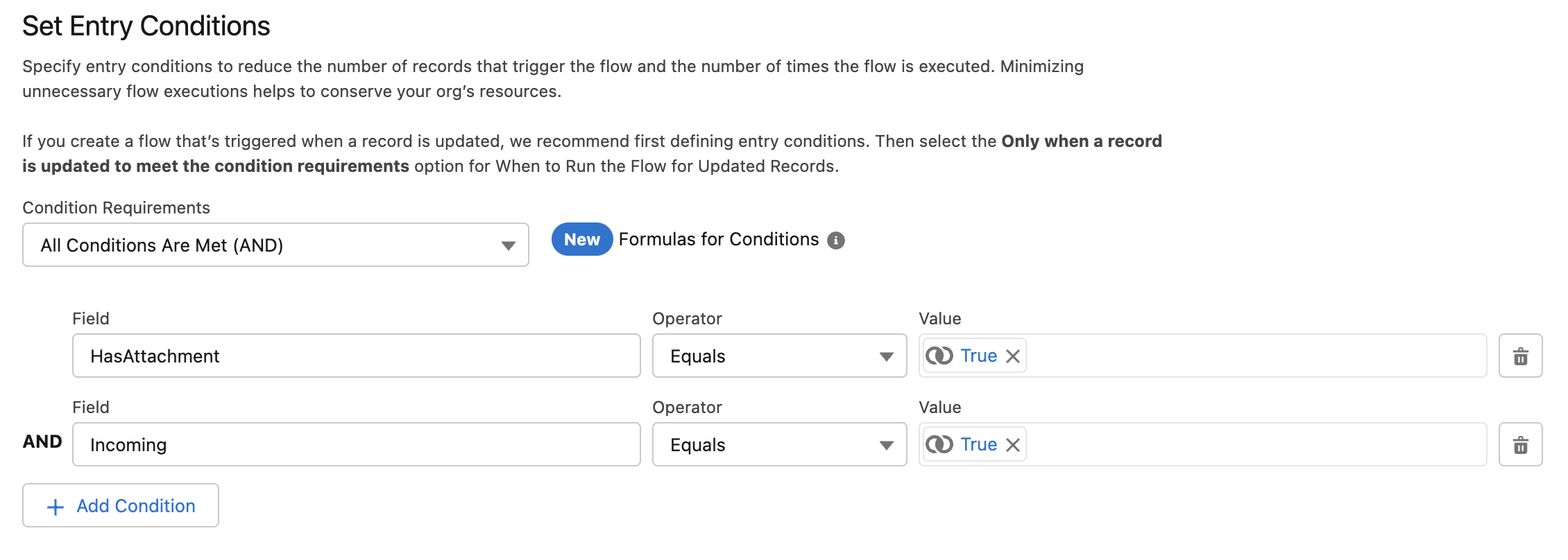 Let’s setup a flow which triggers when an email is received for case creation. We will add filters to only process the emails which have attachments and are incoming. Follow the steps below to set up the flow