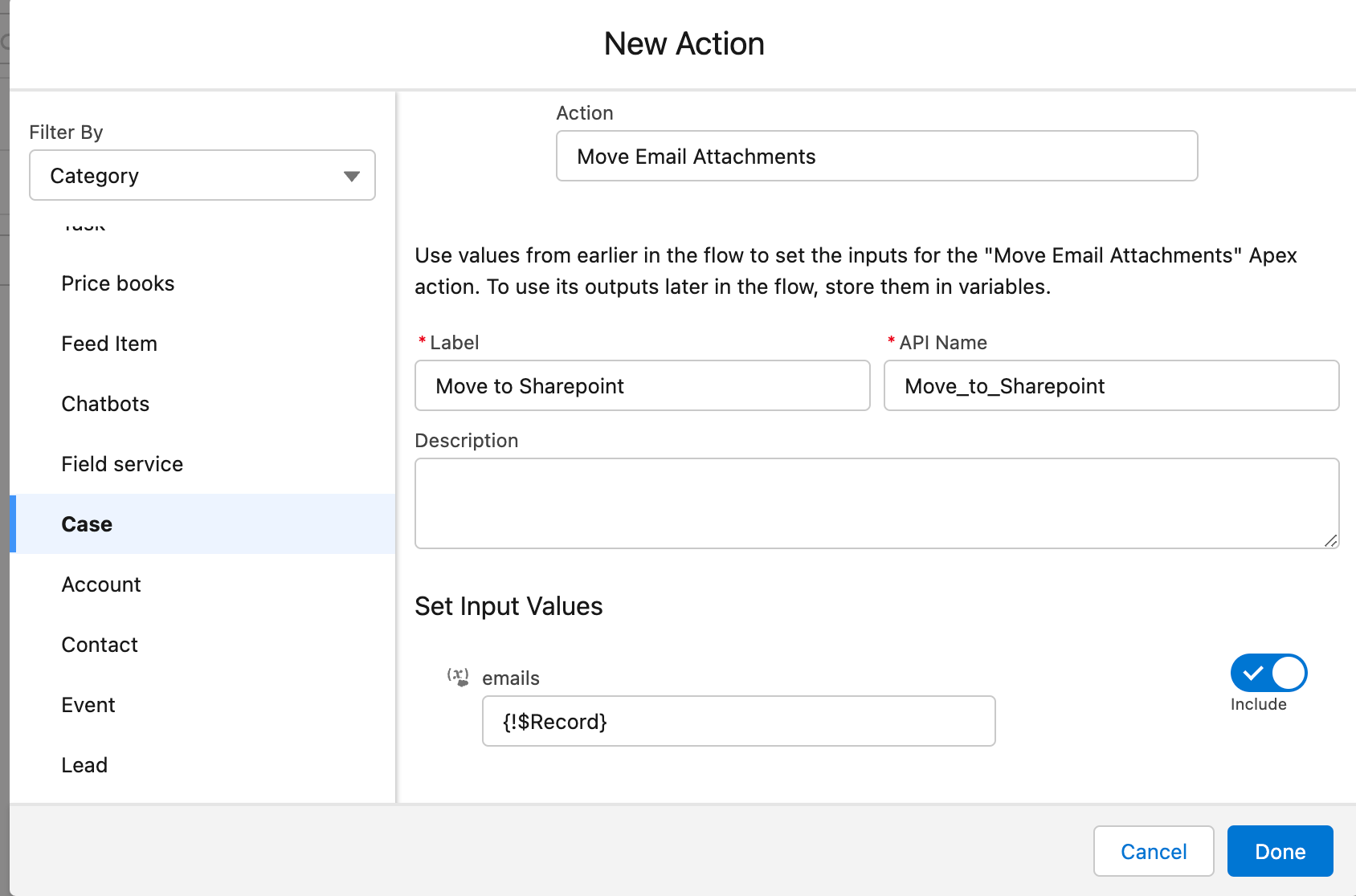 - For the action, we will define an apex action named “Move Email Attachments”. This action actually moves the case attachment to SharePoint