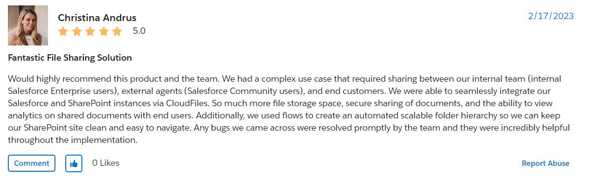 Christina Andrus is a Salesforce administrator at Bridgepointe Technologies. She has been instrumental in setting up this implementation and rolling this out. She could quickly understand the flow actions and widget options that CloudFiles offers and complete a seemingly large implementation in weeks.