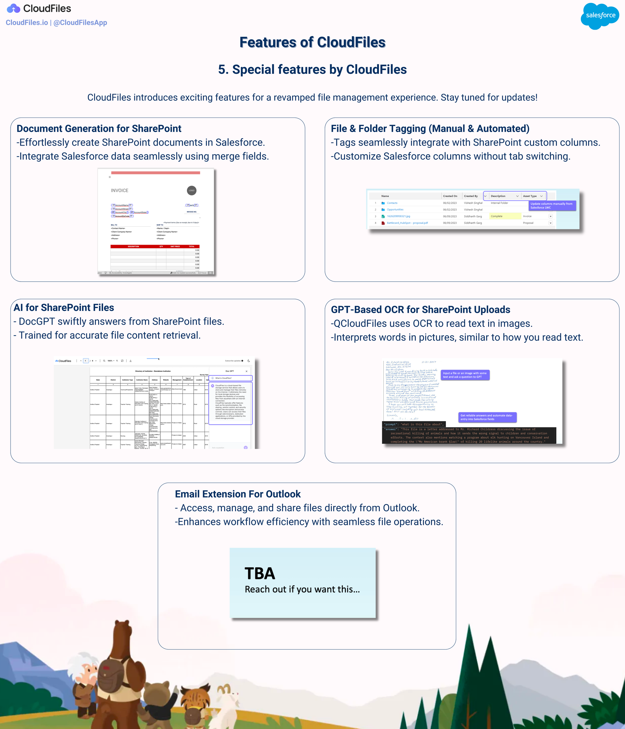 To sum up, the document generation tool simplifies the creation process by integrating Salesforce data into templates. File and folder tagging improves organisation with custom columns in SharePoint. DocGPT serves as a useful assistant for retrieving information from Google Drive files. CloudFiles' AI-based OCR technology advances text recognition in images. These functionalities collectively enhance productivity and efficiency in file and document management within Salesforce. The infographic below provides a concise summary of the information outlined above.