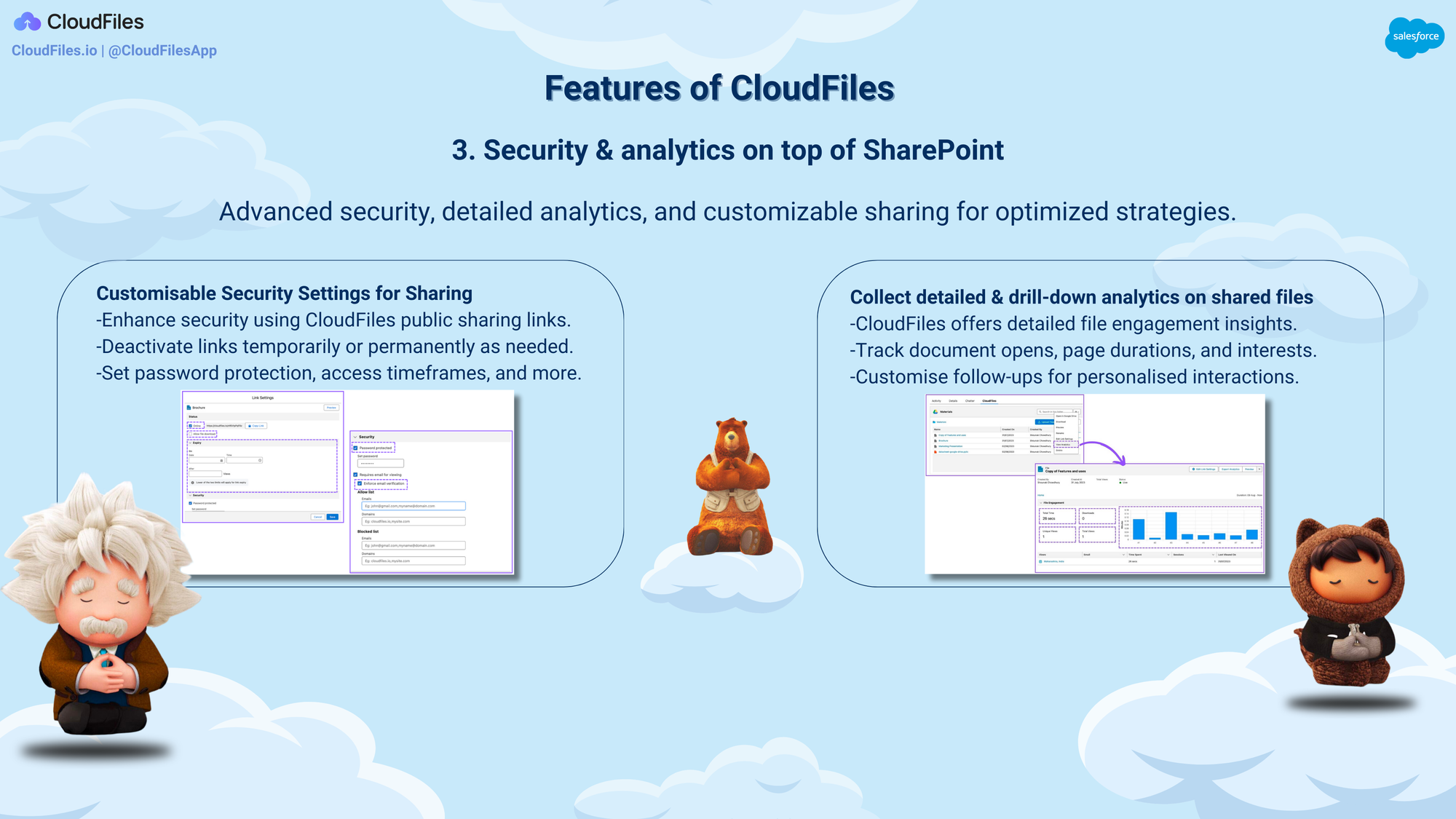 - Security & analytics on top of SharePoint: Here, we'll discuss the enhanced security features provided by CloudFiles and explore the option to analyze page-by-page data for a more detailed understanding.