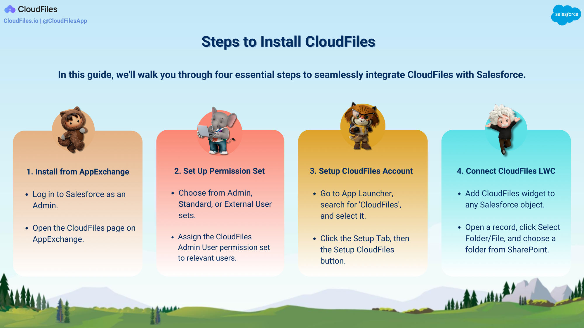 - Steps to install CloudFiles: This guide will help you set up CloudFiles in four simple steps, making the process straightforward. Use this guide for step-by-step instructions and visuals during the installation.