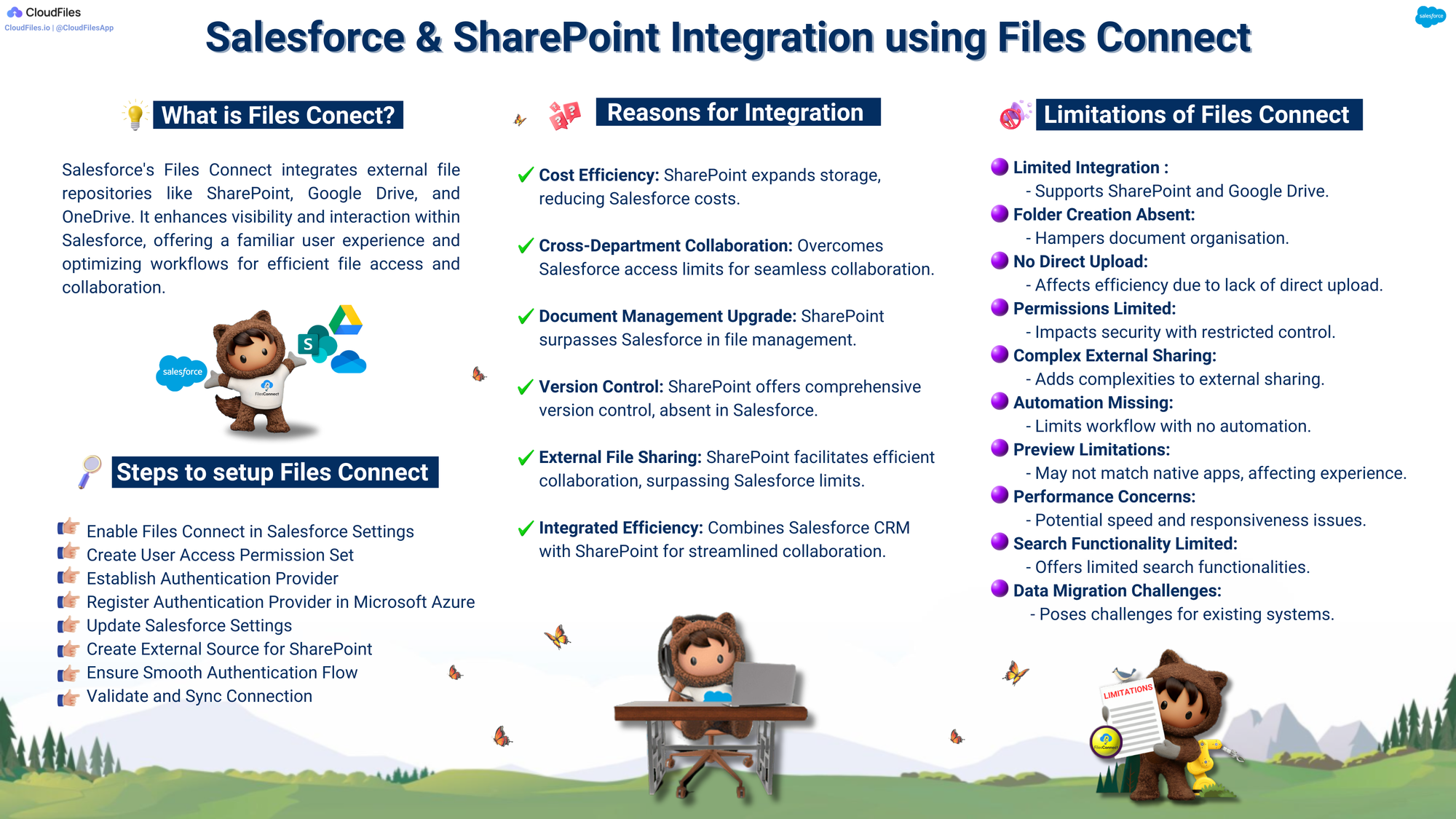 - Salesforce SharePoint Integration using Files Connect: In this section, we will explore the advantages of Salesforce integration with SharePoint, the functionality and capabilities of Salesforce's Files Connect, the steps for setting up and the limitations of Files Connect.