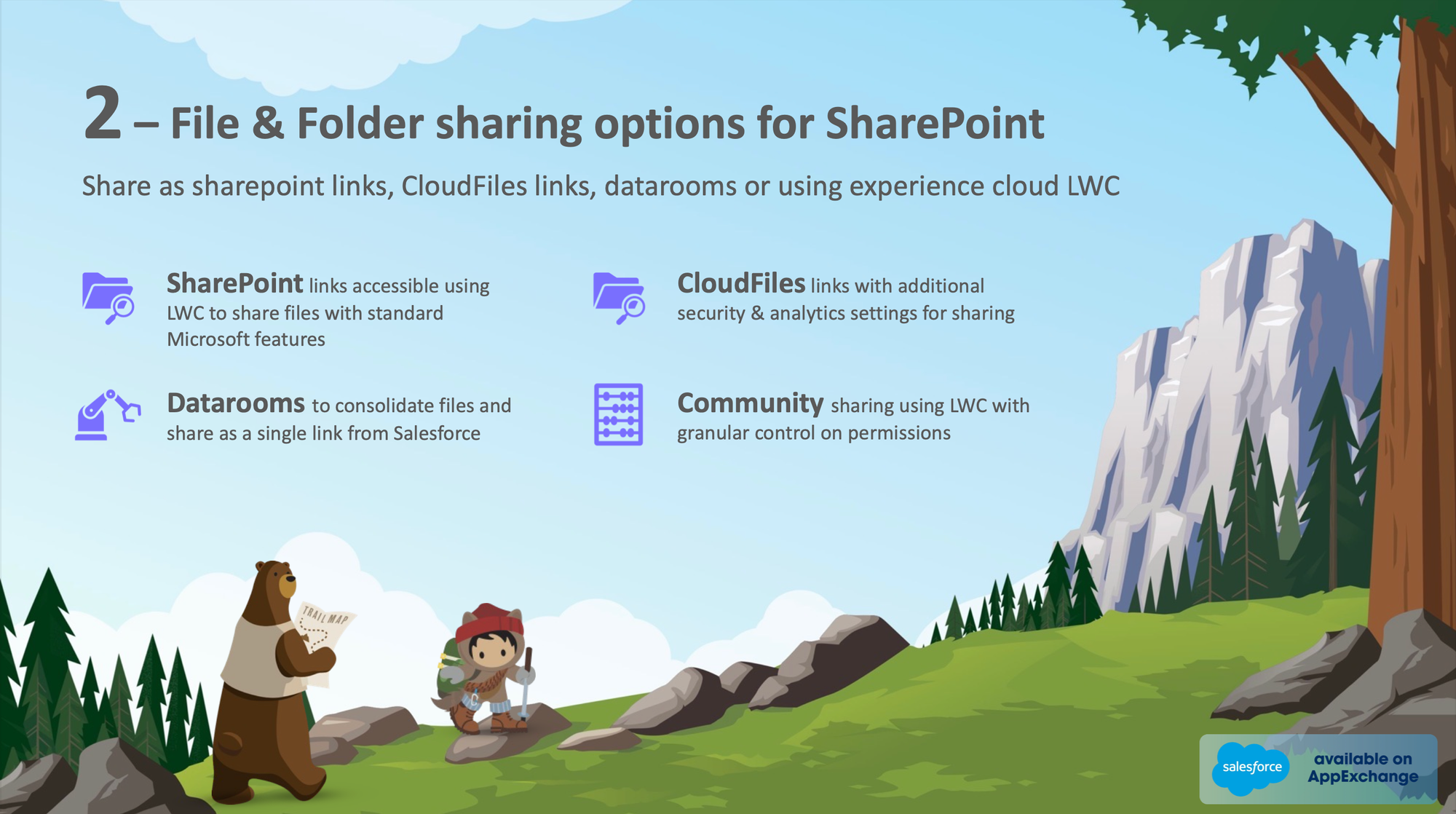 CloudFiles offers several ways to share your file(s) and folder(s). You can share using the traditional SharePoint link, a powerful CloudFiles link, in a consolidated manner as a dataroom or even with the Salesforce Experience Cloud users using our LWC. Here is a summary of all these ways: