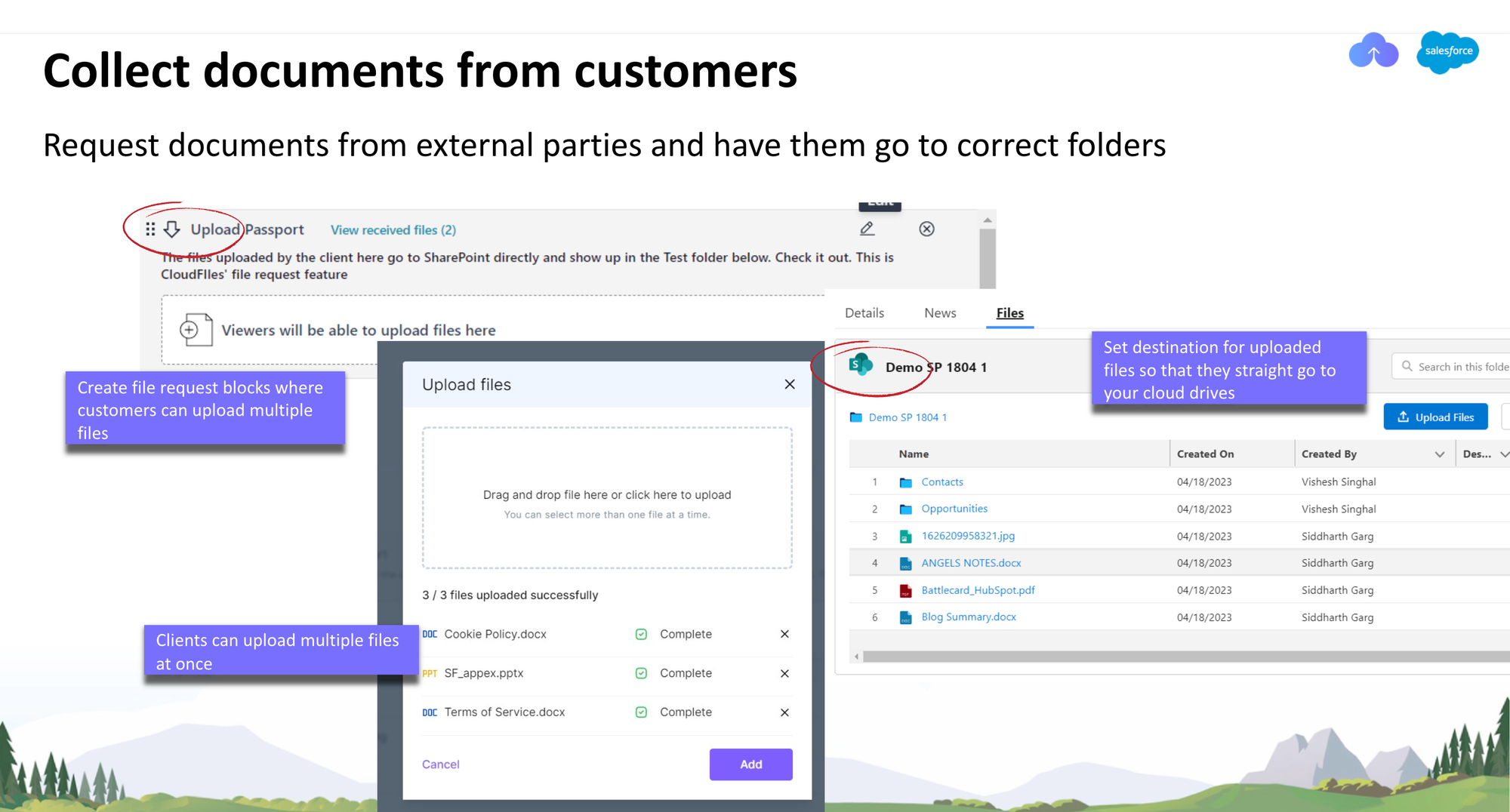 - File Collection - CloudFiles offers practical solutions for tasks like document reception and automated data entry using its own sharing & dataroom features on top of Salesforce & SharePoint.
