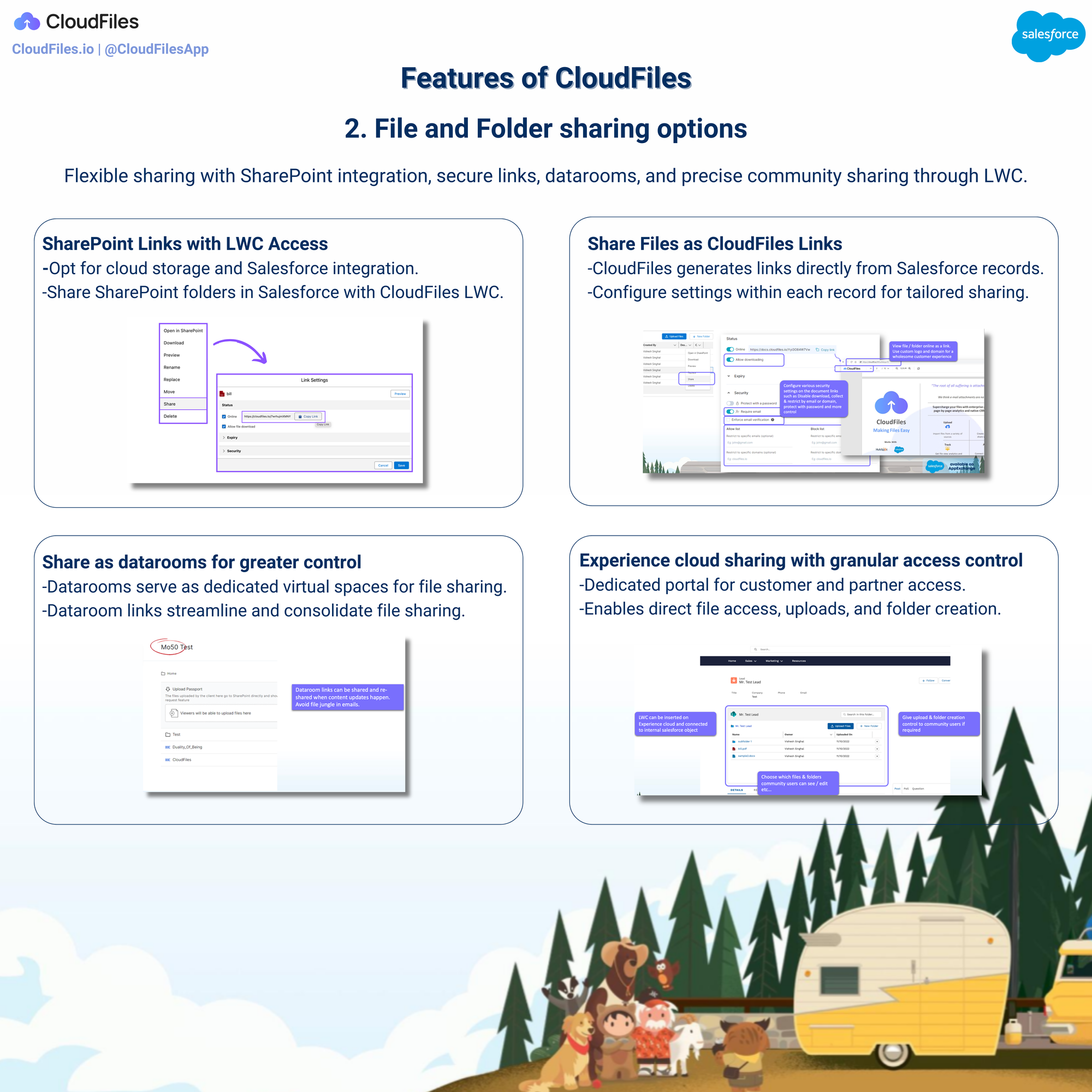 Thus, CloudFiles offers a versatile array of file and folder-sharing options for SharePoint, providing users with a secure experience. Whether through SharePoint links, datarooms, CloudFiles links, or community sharing with LWC, CloudFiles caters to diverse sharing needs within the Salesforce ecosystem.