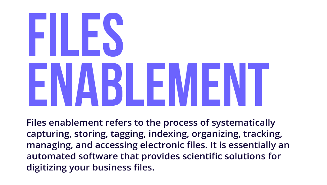 Files enablement refers to the process of systematically capturing, storing, tagging, indexing, organizing, tracking, managing, and accessing electronic files. It is essentially an automated software that provides scientific solutions for digitizing your business files.
