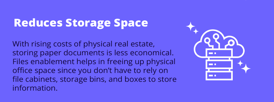 With each passing day, the practice of physical storage of files is becoming redundant. Add to the fact that the costs of commercial properties are increasing, which makes storing paper documents less economical. Files enablement helps in freeing up physical office space since you don’t have to rely on file cabinets, storage bins, and boxes to store information.