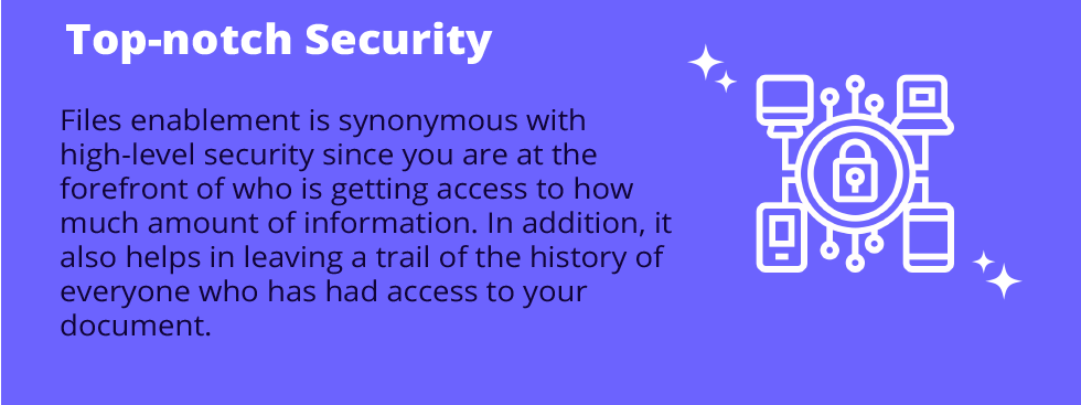 Files enablement is the most effective practice for storing, accessing, and securing all your documents. It makes adapting to the digitization process smoother and you don’t have to constantly worry about having the required file by your side when you travel since you can have access to it from any device at any place.