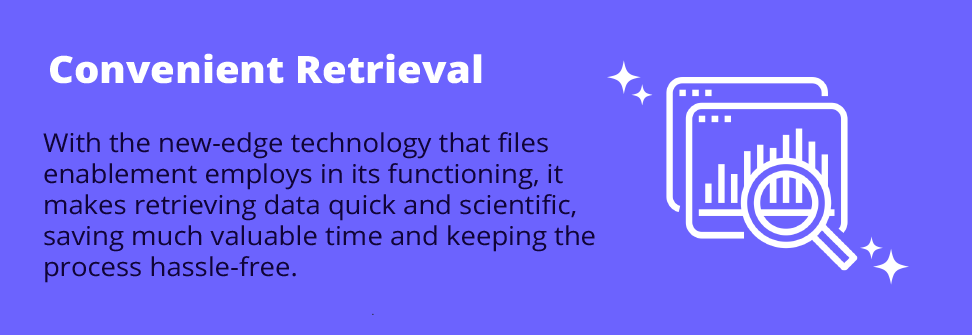 Time is money and the easier the process to retrieve crucial data, the better the productivity of your business is. With the new-edge technology that files enablement employs in its functioning, it makes retrieving data quick and scientific, saving much valuable time and keeping the process hassle-free.