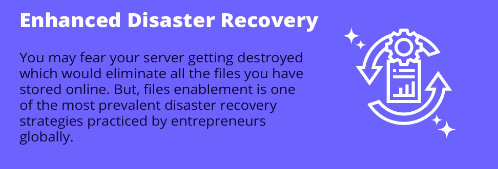 You may fear your server getting destroyed which would tear down all the files you have stored online. But, files enablement takes care of even that concern since it is one of the most prevalent disaster recovery strategies practiced by entrepreneurs globally. As such, your business will continue without any nuisance even when your company’s operations have been disrupted.