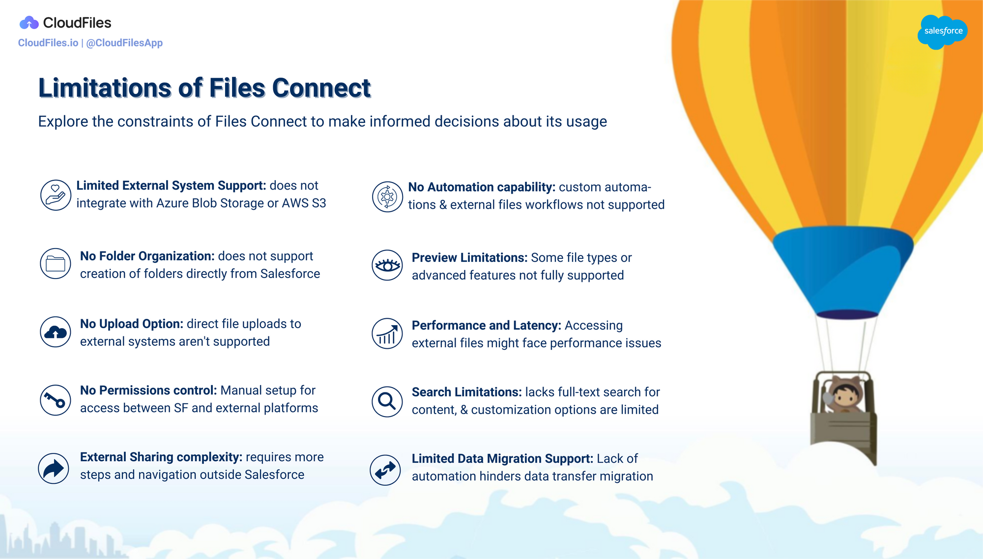 - What are the Limitations of Files Connect? - While Files Connect offers valuable benefits for integrating external storage systems with Salesforce, it's equally crucial to be aware of its limitations. Learn more in this section.