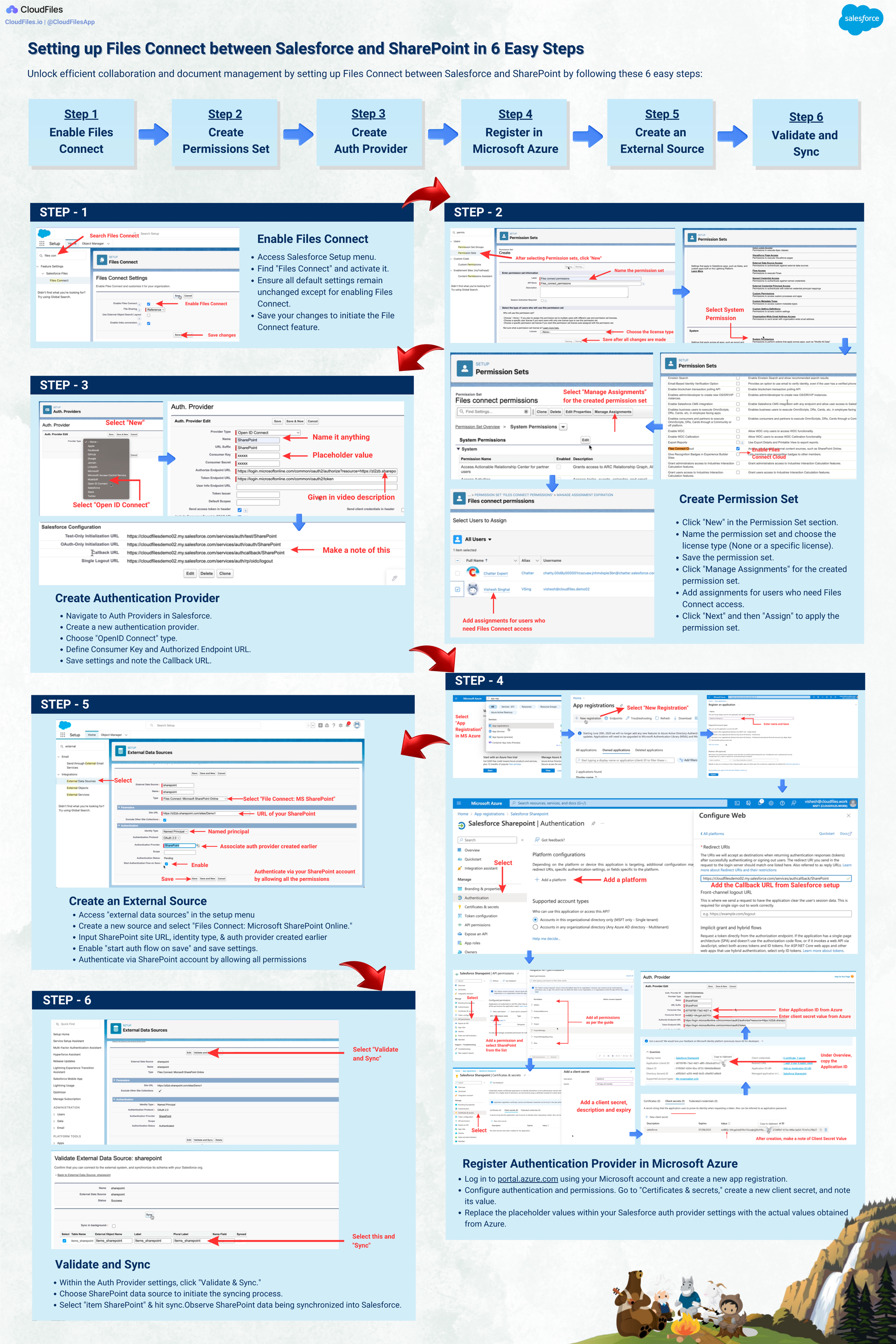 - Setting up Files Connect between Salesforce and SharePoint in 6 Easy Steps - Use this to as a guide to help you quickly and easily setup FIles Connect. We've taken care of every detail, offering step-by-step instructions, images, and a tutorial video.
