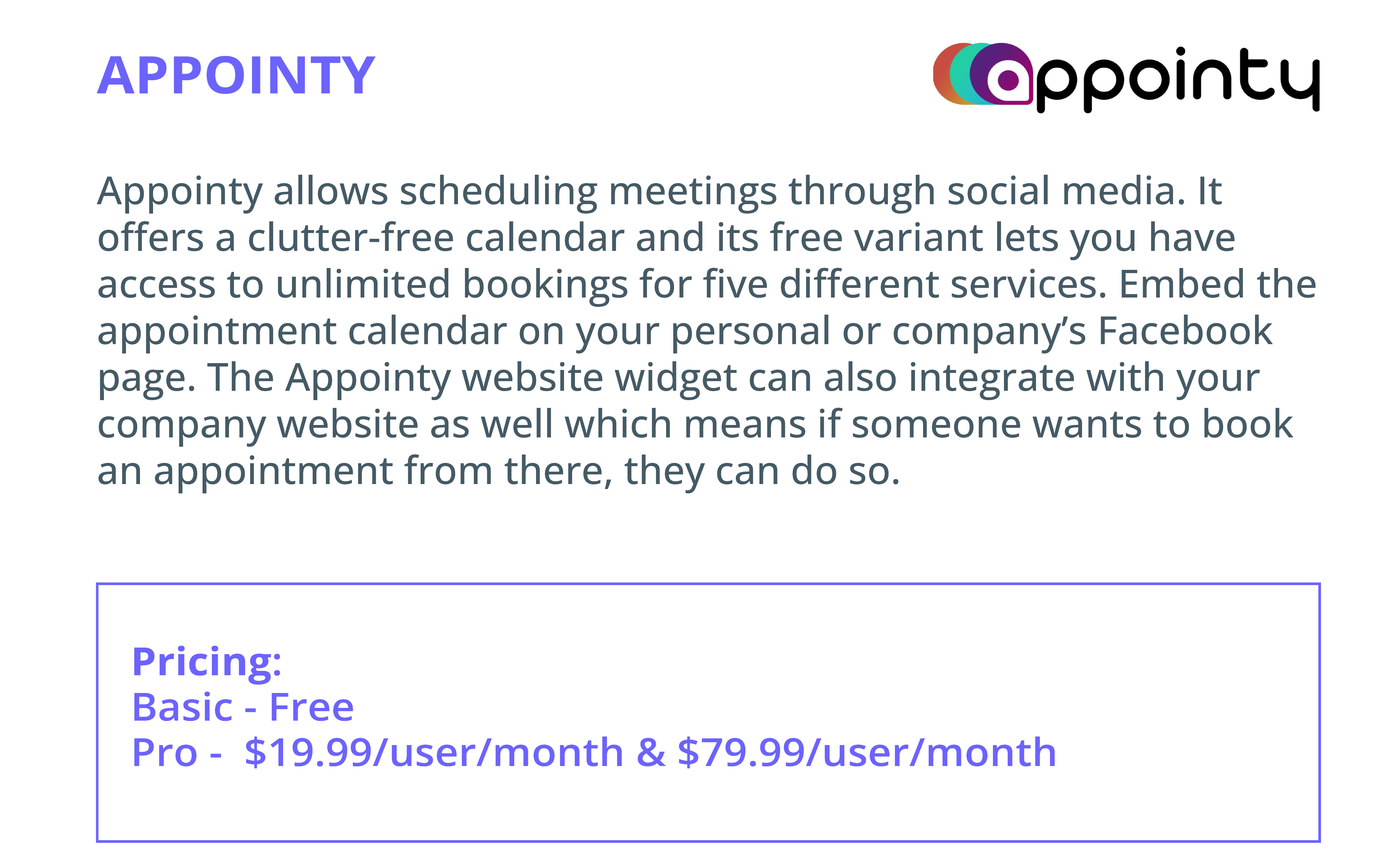 Appointy is the ideal go-to scheduling tool if your business is heavily dependent on social media channels than a website since it allows scheduling meetings through social media channels. It offers a clutter-free calendar and its free variant lets you have access to unlimited bookings for five different services. A paid version of $19.99/user/month-$79.99/user/month gives you additional email marketing integration.