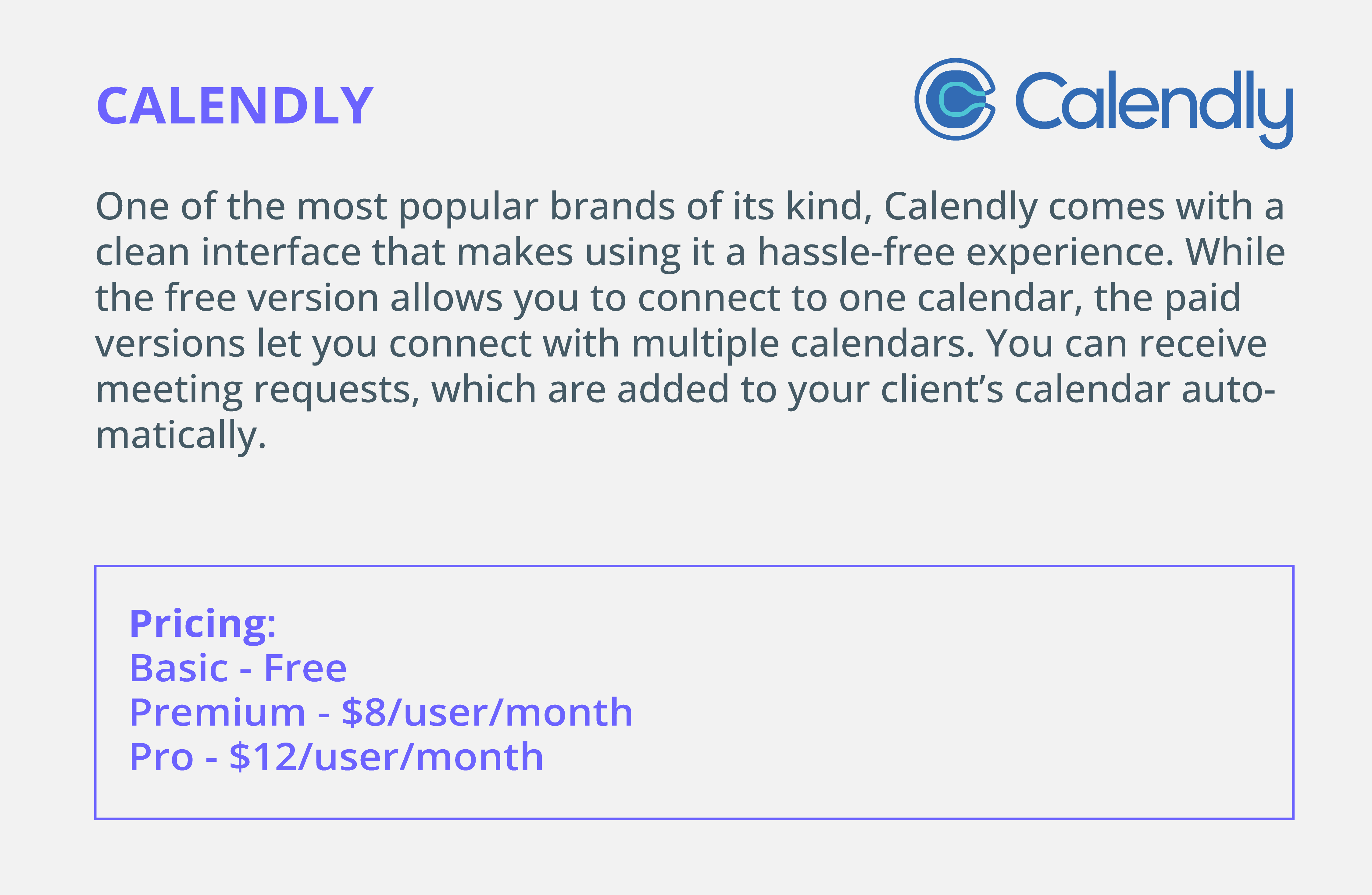 One of the most popular brands of its kind, Calendly comes with a clean interface that makes using it a hassle-free experience. It is available in three variants – basic (which is free to use), premium ($8/user/month), and pro ($12/user/month).