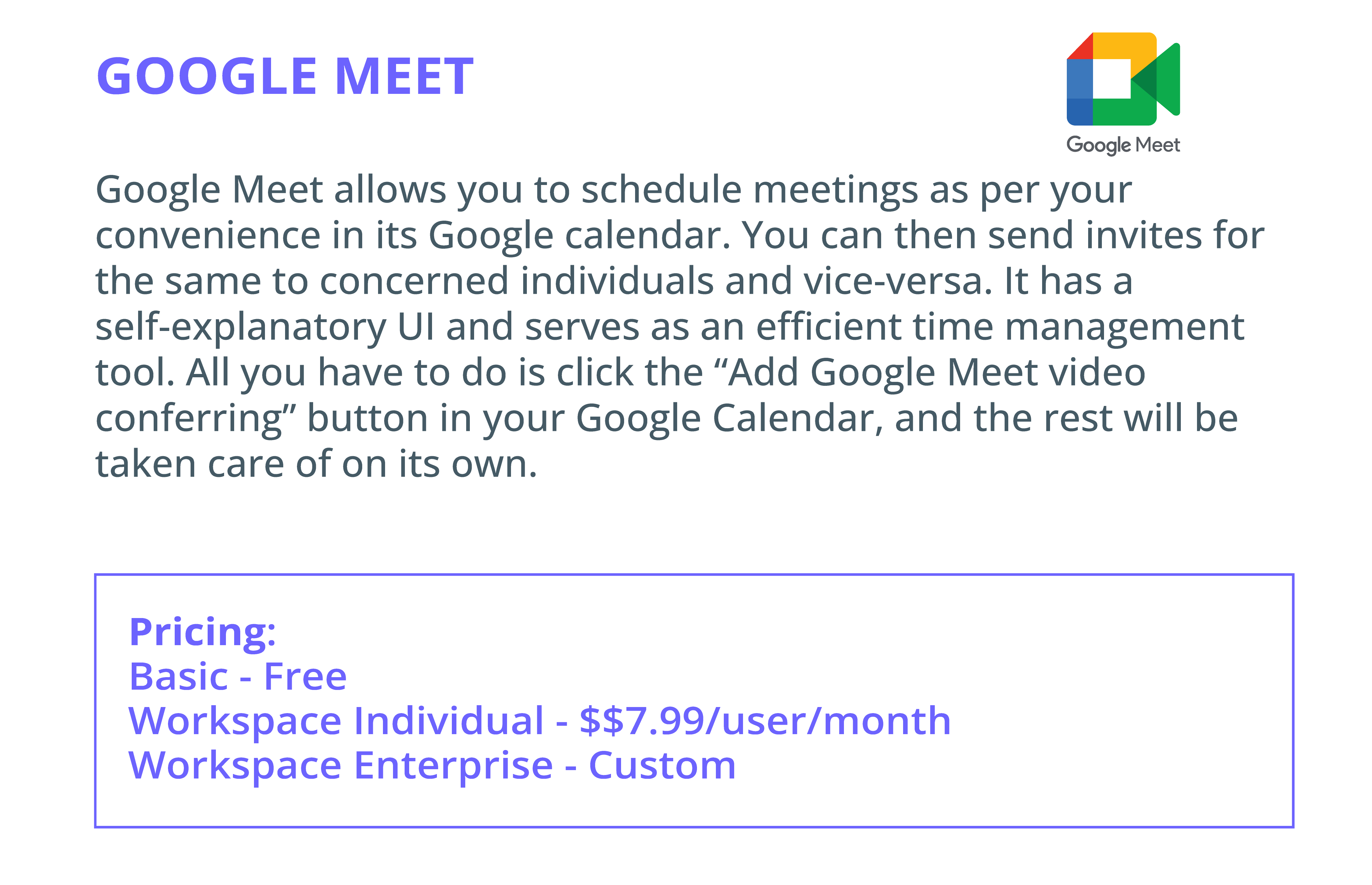 It has a self-explanatory user interface and serves as an efficient time management tool. As such, you don’t have to engage in constant back-and-forth email threads to lock in a date or platform to meet your clients. All you have to do is click the “Add Google Meet video conferring” button in your Google Calendar, and the rest will be taken care of on its own.
