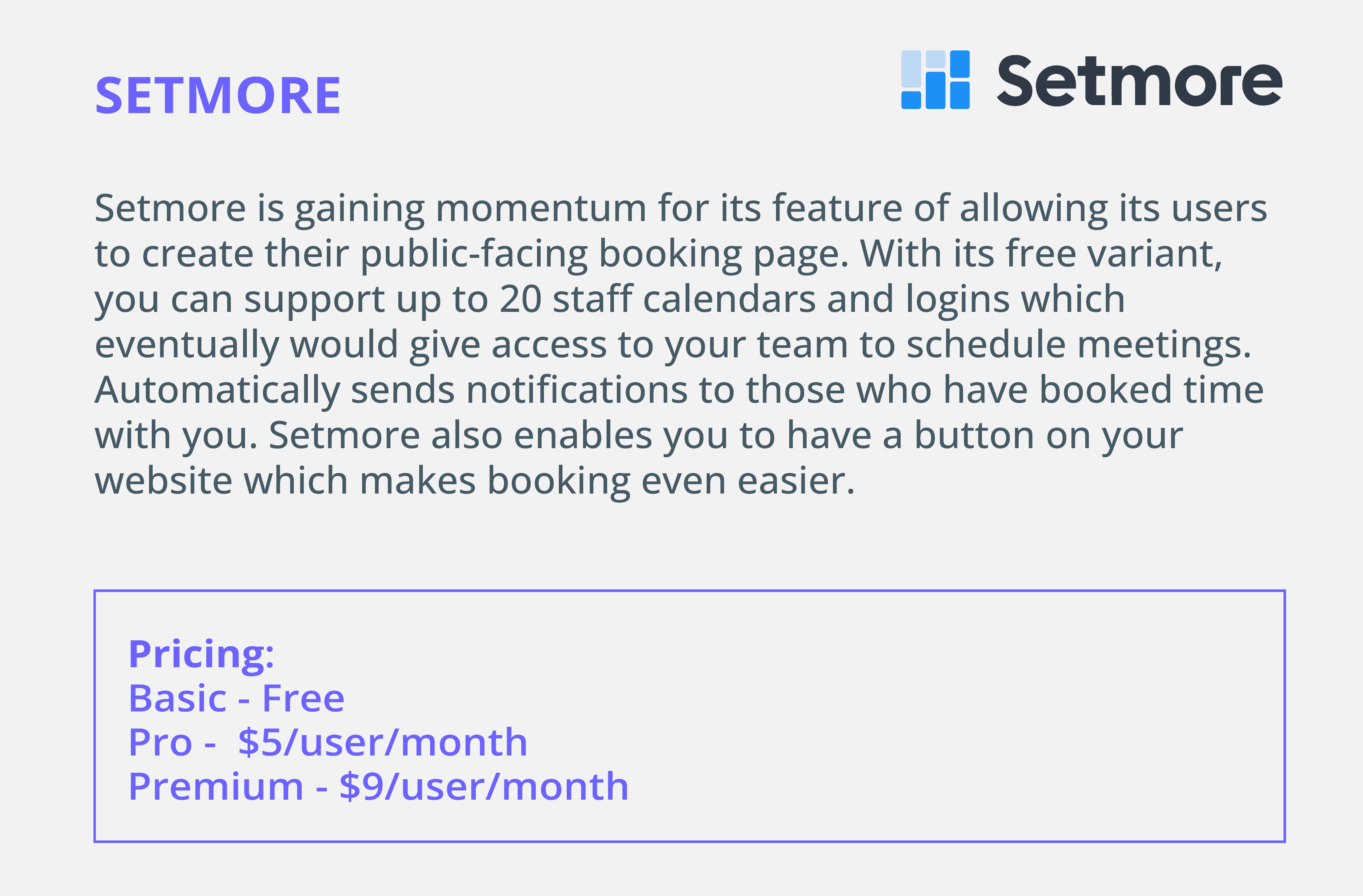 Setmore is gaining momentum for its feature of allowing its users to create their public-facing booking page. With its free variant, you can support up to 20 staff calendars and logins which eventually would give access to your team to schedule meetings.