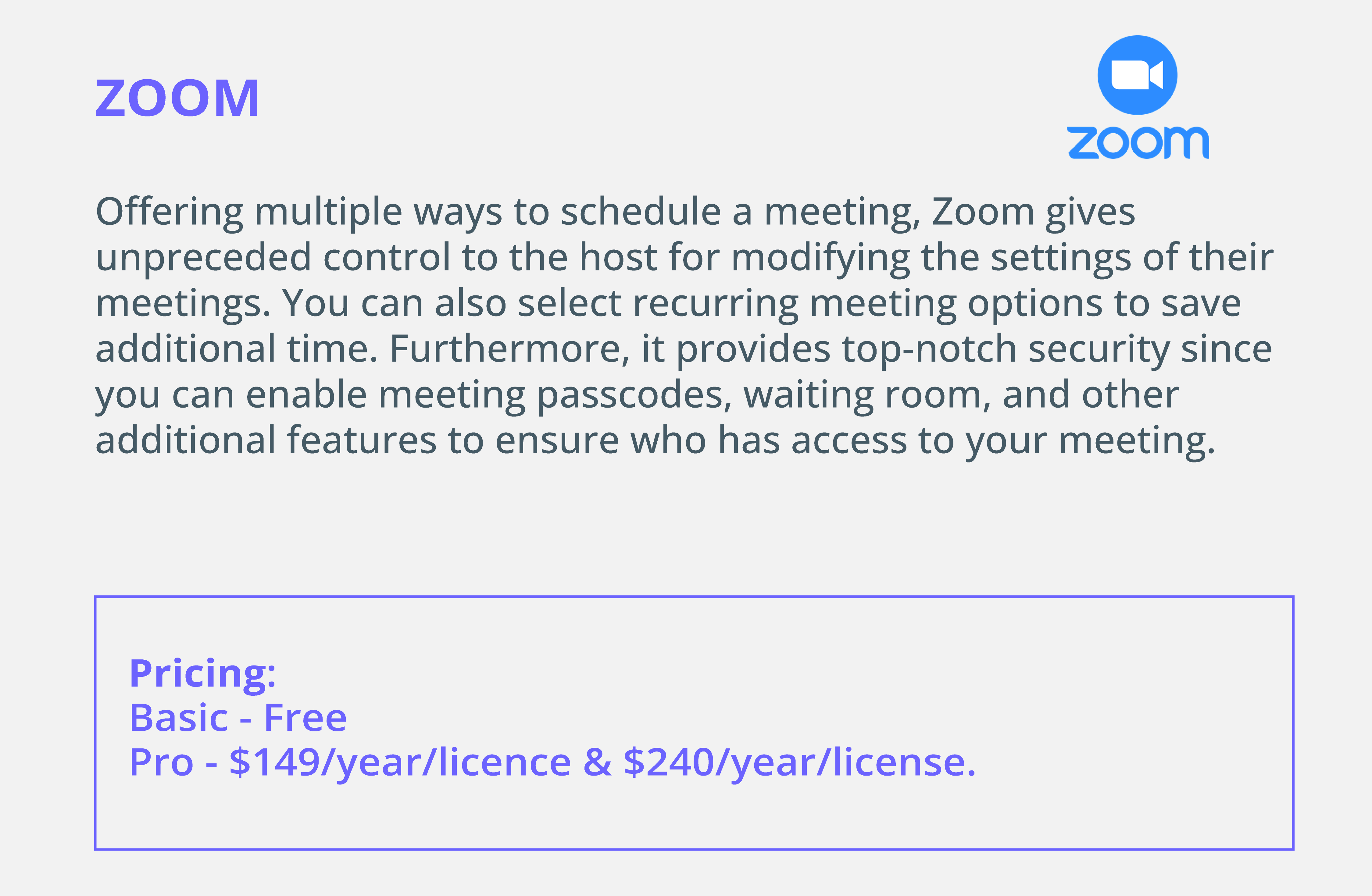 You can also select recurring meeting options to save additional time. Furthermore, it provides top-notch security since you can enable meeting passcodes, waiting room, and other additional features to ensure who has access to your meeting. It has a free version as well as paid versions that are priced at $149/year/licence-$240/year/license.
