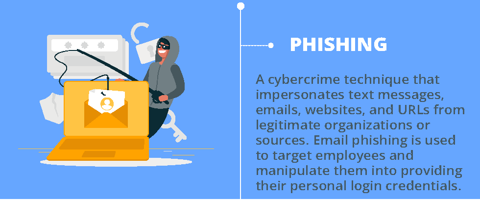 Phishing is a cybercrime technique that impersonates text messages, emails, websites, and URLs from legitimate organizations or sources. Email phishing has been in existence since the 1990s. Cybercriminals use email phishing to target employees and manipulate them into providing their personal information. Once you provide your credentials, the hackers gain access to your system and steal your company’s confidential information or install malware into your system.