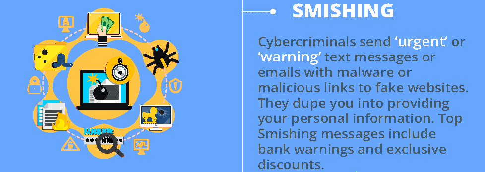 Smishing is a social engineering technique that uses mobile phones as attacking platforms. Cybercriminals send ‘urgent’ or ‘warning’ text messages or emails with malware or malicious links to fake websites. They dupe you into providing your personal information. Top Smishing messages include bank warnings and exclusive discounts.
