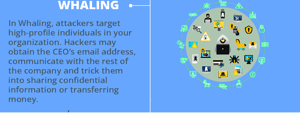 In Whaling, attackers target high-profile individuals in your organization. Hackers initially obtain your CEO’s email address and communicate with you through the same mail id. They masquerade as your CEO and trick you into sending the company’s confidential information or transferring money.