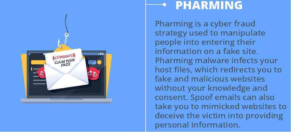 Pharming is a cyber fraud strategy used to manipulate people into entering their information on a fake site. There are two ways of pharming. First, Pharming malware infects your host files with malware, which redirects you to fake and malicious websites without your knowledge and consent. Second, DNS poisoning uses email spoofing to take you to mimicked websites to deceive and trick you into providing your personal information.