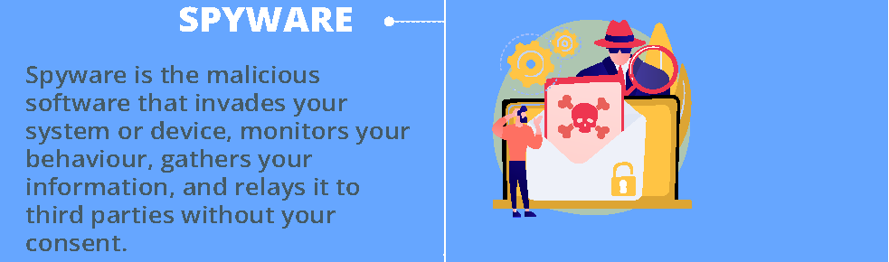 Spyware is the malicious software that invades your system or device, monitors your behavior, gathers your information, and relays it to third parties without your consent. Spywares are difficult to identify because they enter the device without your knowledge or consent. Downloading something from unreliable sources or clicking on pop-ups or links can infect your system.