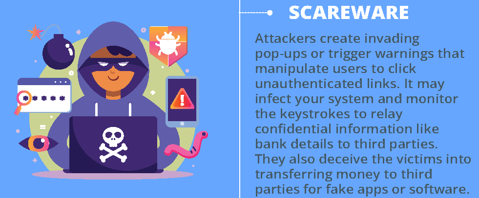 Scareware is a social engineering-cum-psychological tactic used to redirect users to malicious or fake websites. Attackers create invading pop-ups or trigger warnings that manipulate users to click unauthenticated links. It may infect your system and monitor the keystrokes to relay confidential information like bank details to third parties. They also deceive the victims into transferring money to third parties for fake apps or software.