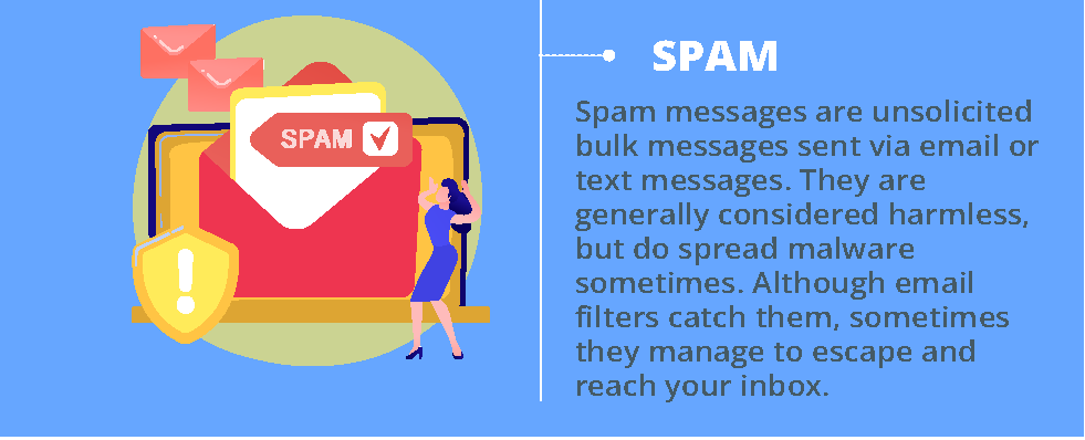Spam messages are unsolicited bulk messages sent via email or text messages. Spam messages are considered harmless, but they do spread malware sometimes. Although email filters catch these emails, they manage to escape and trick you into furnishing your private information.