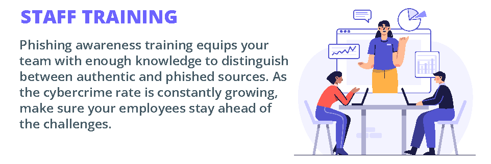 The first line of defense against these email attacks is training your staff. Phishing awareness training equips your team with enough knowledge to distinguish between authentic and phished sources. As the cybercrime rate is constantly growing, make sure your employees stay ahead of the challenges. Imparting knowledge about newer methodologies beyond phishing helps you build resilient teams.