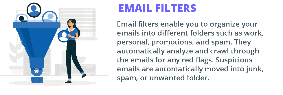Email filters enable you to organize your emails into different folders such as work, personal, promotions, and spam. They automatically analyze and crawl through the emails for any red flags. Suspicious emails are automatically moved into junk, spam, or unwanted folder.