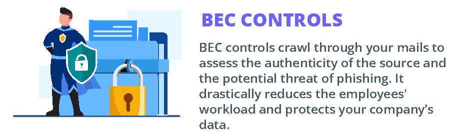 Email security gateways help detect automated, impersonated and spoofed emails. BEC controls crawl through your mails to assess the authenticity of the source and the potential threat of phishing. It drastically reduces the employees' workload and protects your company’s data.