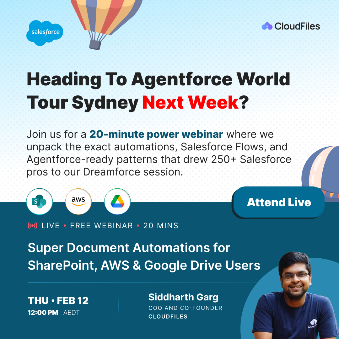 In this 20-minute live webinar, discover how industry leaders are using Salesforce Flows to automate document workflows end-to-end—from creation and approvals to secure storage across SharePoint, AWS, and Google Drive.