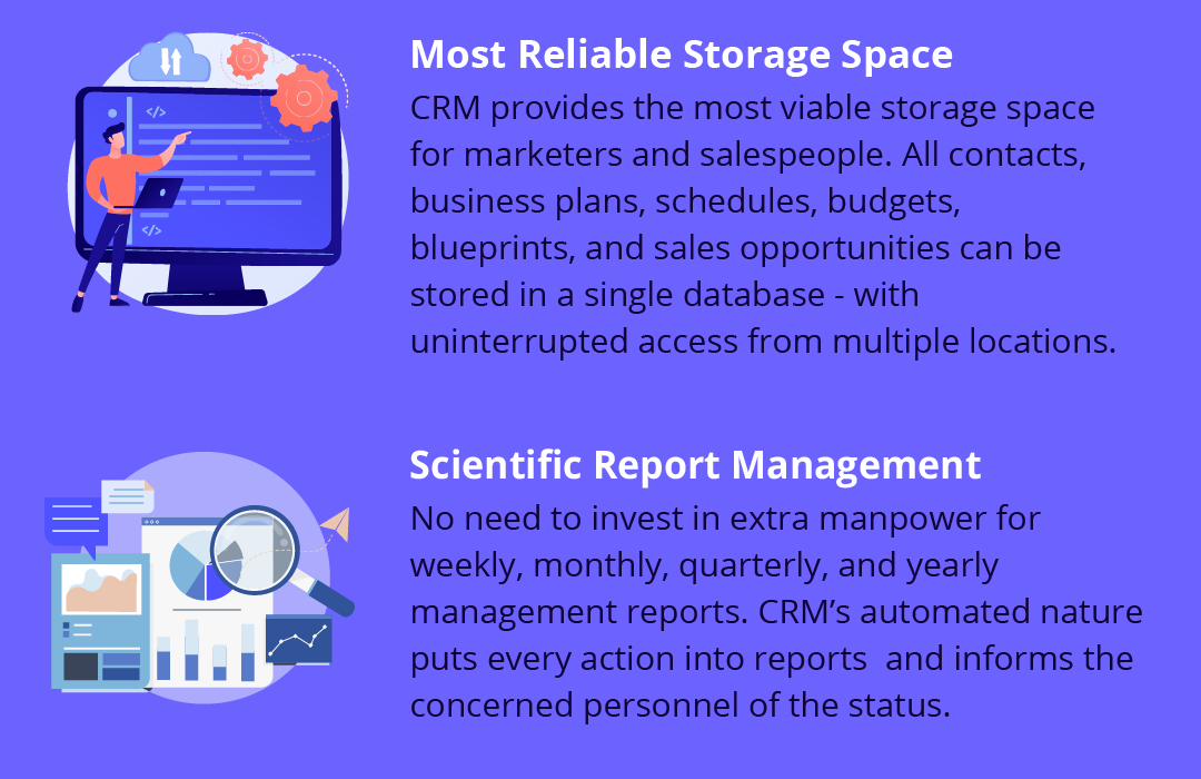 You don’t need to invest in extra manpower for preparing weekly, monthly, quarterly, and yearly management reports when you have CRM in your business. Its automated nature puts every action into reports on its own and informs the concerned personnel of the status of progress.