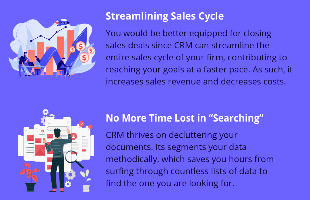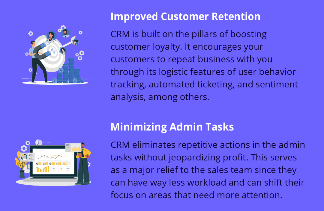 CRM eliminates repetitive actions in the admin tasks without jeopardizing profit. This serves as a major relief to the sales team since they can have way less workload and can shift their focus on areas that need more attention.