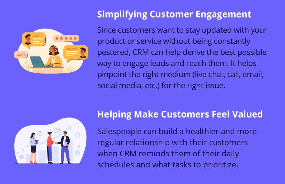 Since customers want to stay updated with your product or service without being constantly pestered, CRM can help derive the best possible way to engage leads and reach them. It helps in finding which medium to assort (live chat, call, email, social media, etc.) for addressing which issue.