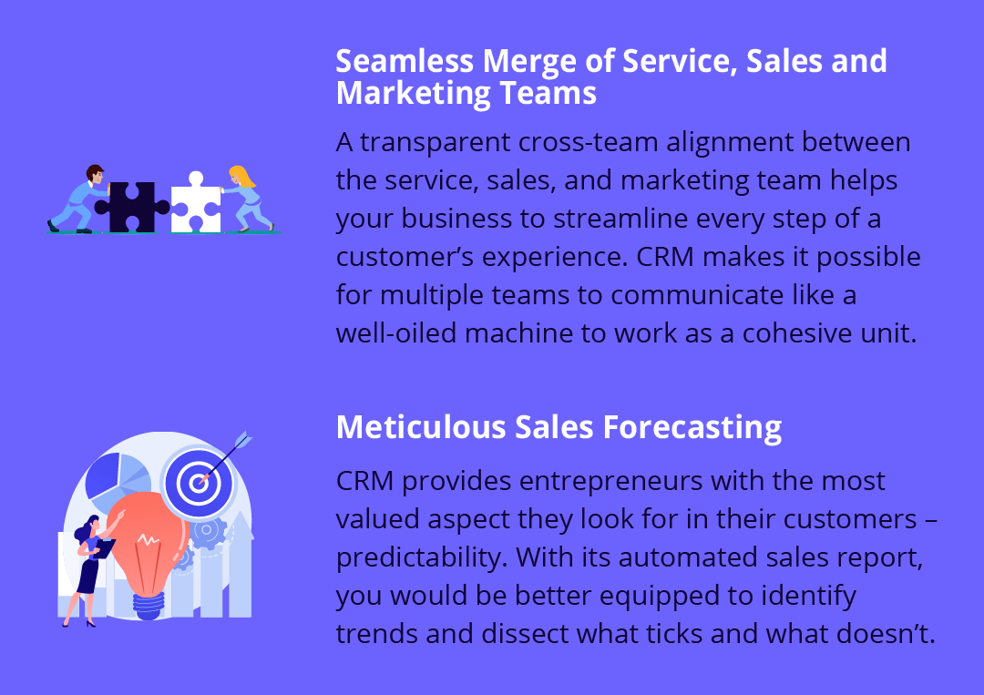CRM provides entrepreneurs with the most valued aspect they look for in their customers – predictability. With its automated sales report, you would be better equipped to identify trends and dissect what ticks and what doesn’t. As such, you can strategically plan for the upcoming period and adjust if the need arises.