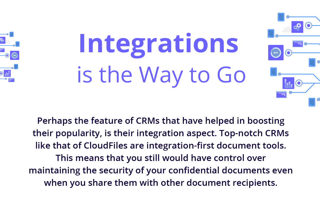 Perhaps the feature of CRMs that has helped in boosting their popularity is its integrations aspect. Top-notch CRMs like HubSpot and Salesforce have integrations like that of CloudFiles which are integration-first document tools. This means that you still would have control over maintaining the security of your confidential documents even when you share them with other document recipients, all while staying inside your CRM ecosystem.